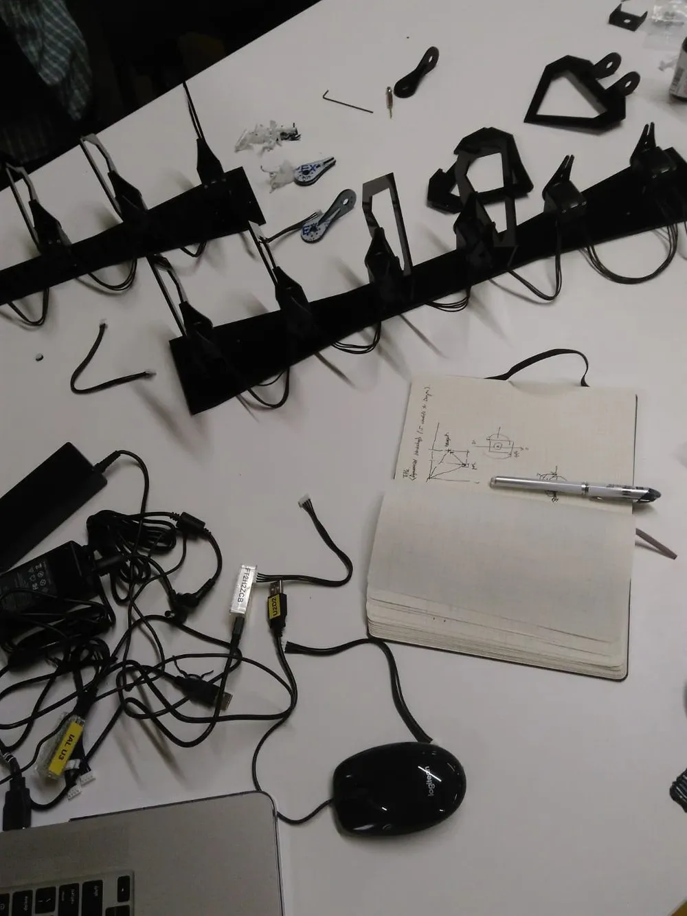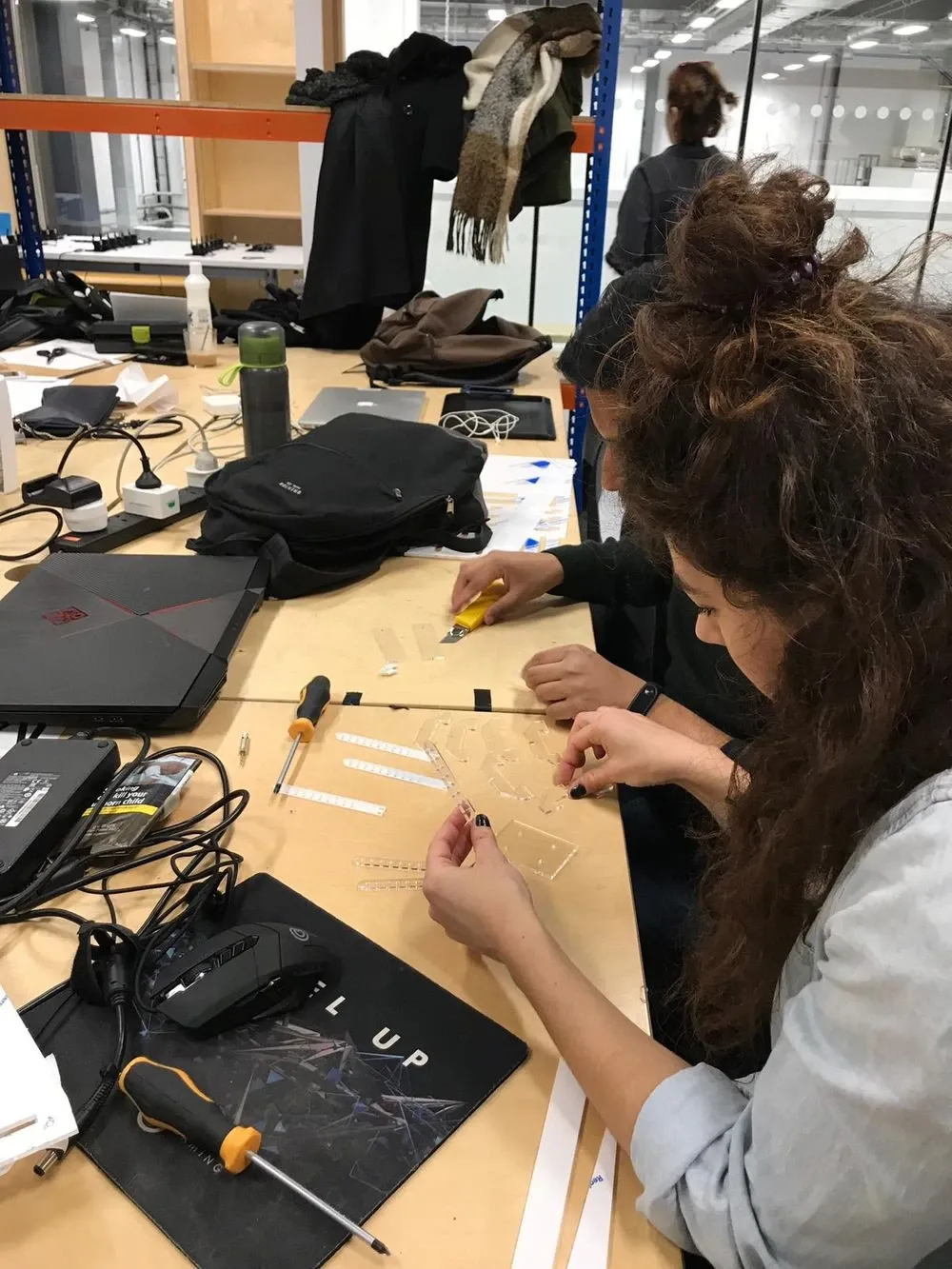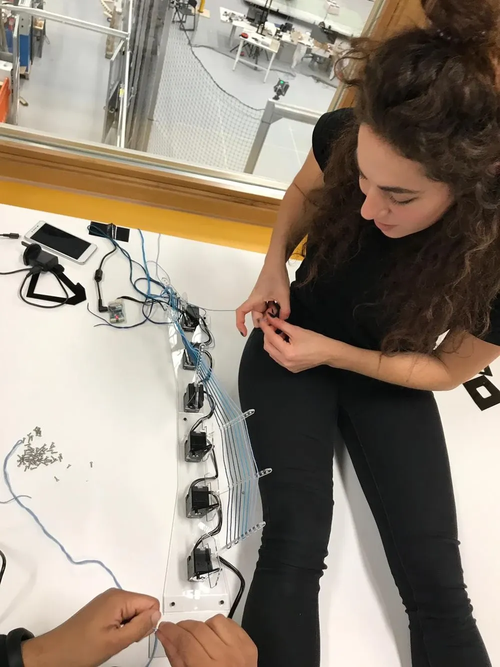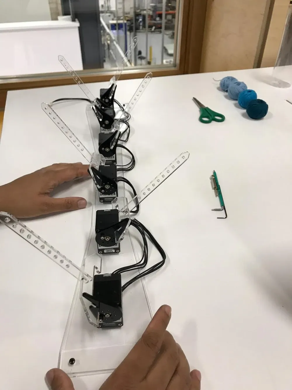 String Theory (2018) is a kinetic sculpture born from an explorative kinetic choreography workshop. Focusing on the study and design of waveform motion patterns. Sinusoid waveforms inform stepper motor coordinates adjusting acrylic struts interlaced with coloured string evoking ocean wave tendencies within the sculpture.